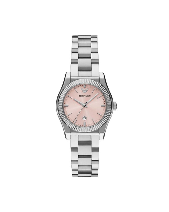The Emporio Armani Federica AR11658 women's watch combines modernity and subtle design. The 32 mm wide silver stainless steel envelope works perfectly with the pink dial covered with mineral glass. The bracelet is made of stainless steel in the same silver tone. The model is equipped with a date pad, which indicates the day of the month. Powered by a quartz mechanism, the product features a water resistance of up to 50 meters.