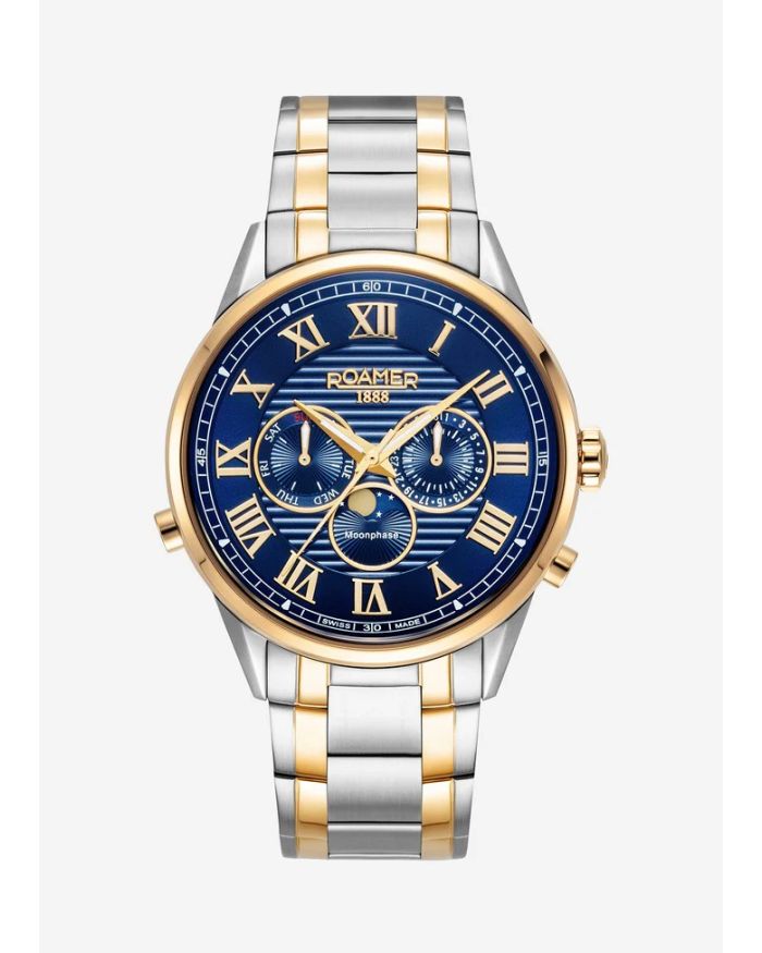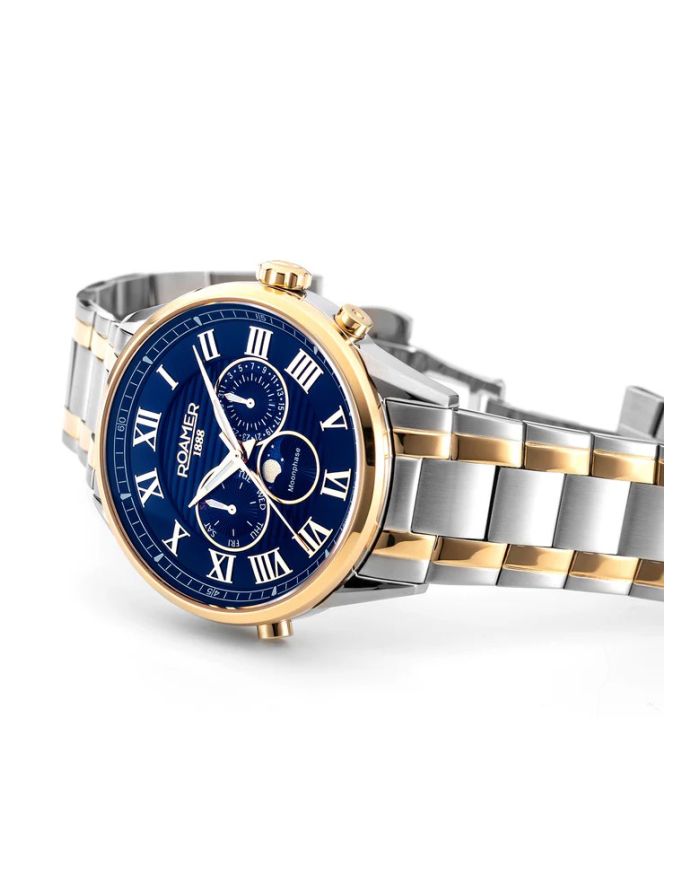 Humankind has always been fascinated by the moon; quite a few still see a spiritual influence in the moon’s phases. Howsoever, watches featuring a moon phase compilation are striking timepieces with a very special touch. With 3 central hands and 3 sub-dial displays, the very dressy SUPERIOR MOONPHASE has all the hallmarks of a clean and simple moon phase watch. The beautifully structured dial background with line pattern guilloche, straight baton markers, and a discreet minuterie edged by Roman numerals give this watch a unique look. Day- and date sub-dials form an awesome trio with the moonphase dial at 6 o’clock. The round 43 mm stainless steel case is also available in two-tone design with rose gold plating.