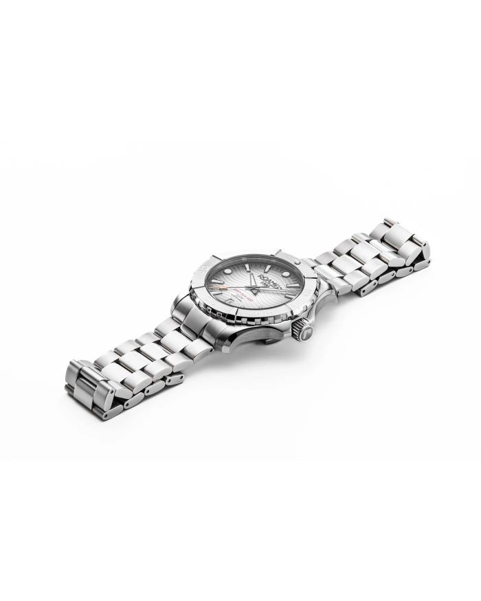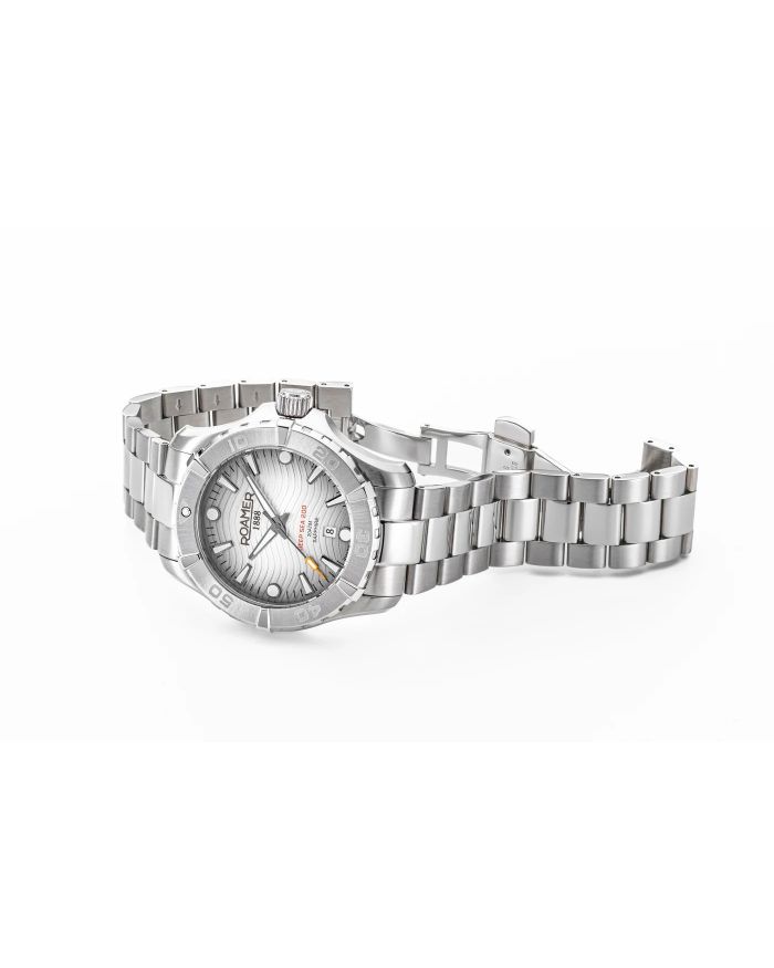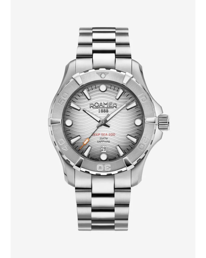 One of the particularly remarkable new ROAMER releases of this year is the sporty-elegant DEEP SEA 200. With a spectacular water-resistance of 200 m, it even tolerates a jump in the pool or a dive in the ocean. Aside from diving, this statement watch is a guaranteed eye-catcher on the wrist and scores with a sophisticated mix of precise function and stylish design. The DEEP SEA 200 features an anti-reflection sapphire crystal and a 43 mm tonneau-shaped stainless steel case housing a trusted high quality Swiss Made quartz movement.