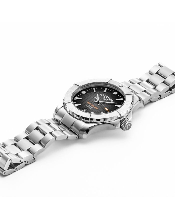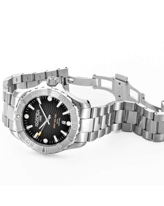 One of the particularly remarkable new ROAMER releases of this year is the sporty-elegant DEEP SEA 200. With a spectacular water-resistance of 200 m, it even tolerates a jump in the pool or a dive in the ocean. Aside from diving, this statement watch is a guaranteed eye-catcher on the wrist and scores with a sophisticated mix of precise function and stylish design. The DEEP SEA 200 features an anti-reflection sapphire crystal and a 43 mm tonneau-shaped stainless steel case housing a trusted high quality Swiss Made quartz movement.
