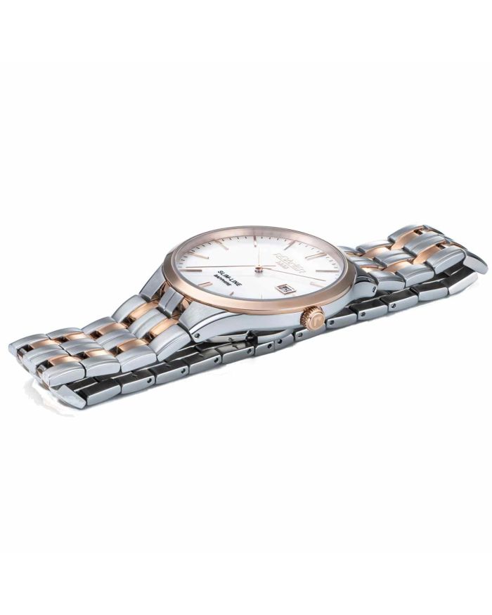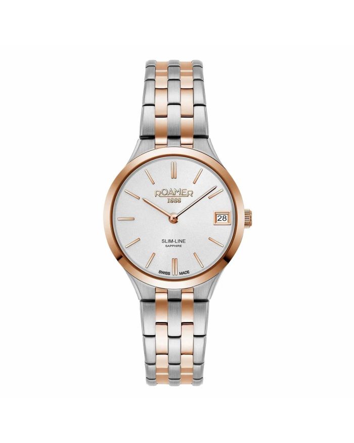 Discover timeless elegance with the Roamer 512857 49 15 20 Women's Slim Line Classic Wristwatch, mirroring the aesthetics of the men's version with a sleek bezel, fluted crown featuring the iconic "R" emblem, and a delicate date window at 3 o'clock. These meticulously crafted elements are complemented by a sturdy stainless steel bracelet, offered in gold or rose-gold plating or a two-tone design. The female version showcases a compact 30 mm case and a simple, clutter-free dial without the minuterie found on the male model.