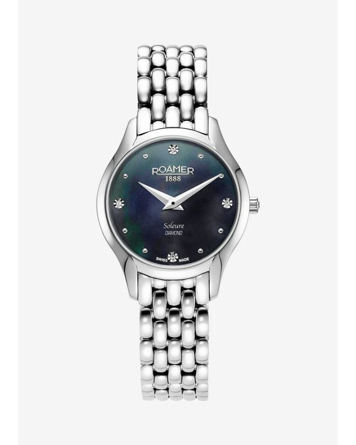 The magic sparkle of genuine diamonds on a shimmering mother-of-pearl dial makes the new Soleure Diamond an eye-catching, noble watch. But there is more to that the built-in precise Swiss-made quartz 2 H movement Ronda-762E-A2 measures time as precisely as you could wish. On the round dial of the elegant watch, four captivating real diamonds are complemented by eight delicately designed round indices. Two classic dauphine hands stand out against the shimmering mother-of-pearl dial. The 30 mm stainless steel case and seems to flow seamlessly into a stylish bracelet.