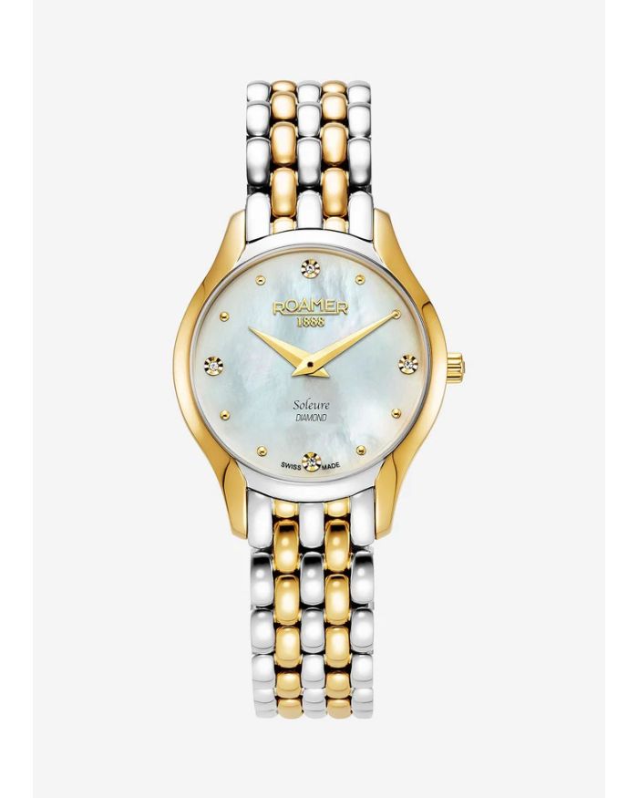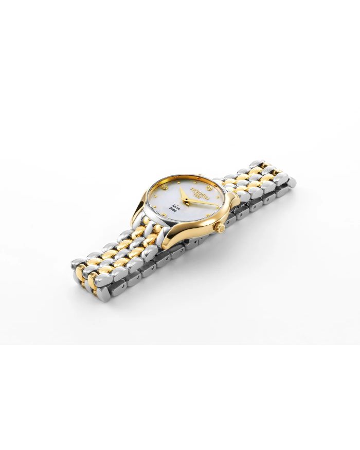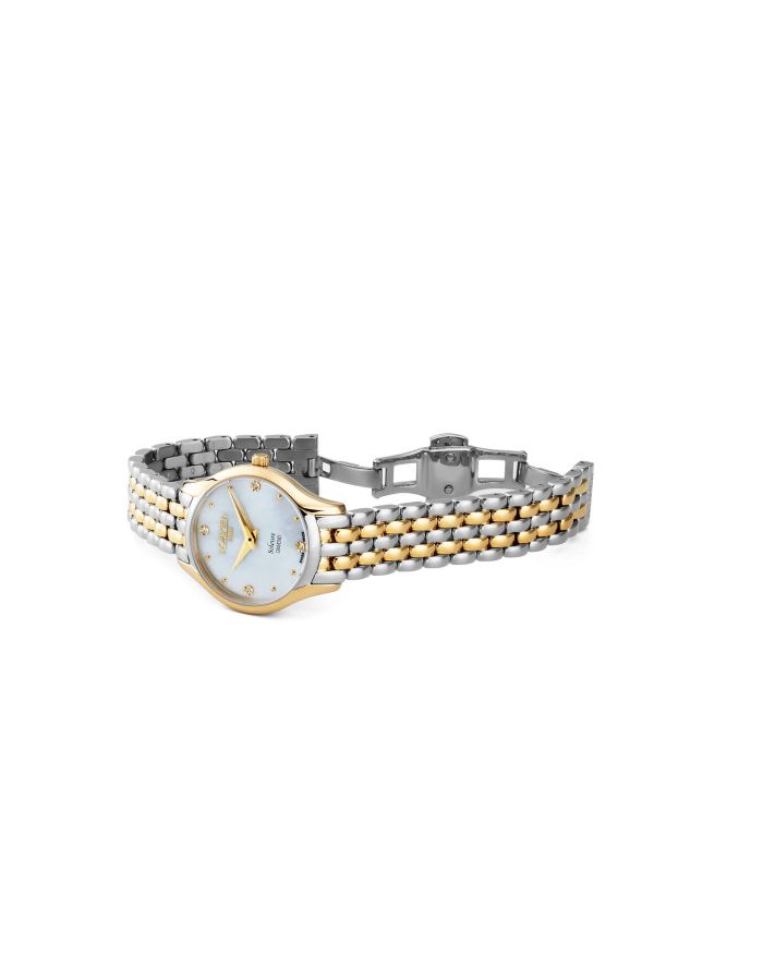 The magic sparkle of genuine diamonds on a white mother-of-pearl dial makes the new Soleure Diamond an eye-catching, noble watch. But there is more to that the built-in precise Swiss-made quartz 2 H movement Ronda-762E-A2 measures time as precisely as you could wish. On the round dial of the elegant watch, four captivating real diamonds are complemented by eight delicately designed round indices. Two classic dauphine hands stand out against the shimmering mother-of-pearl dial. The 30 mm stainless steel case and seems to flow seamlessly into a stylish bracelet.