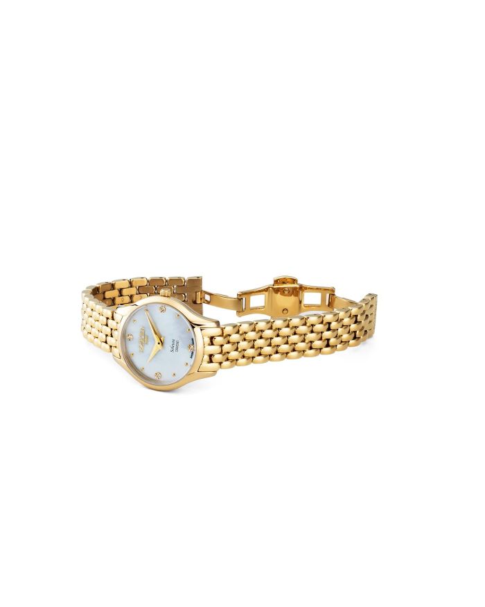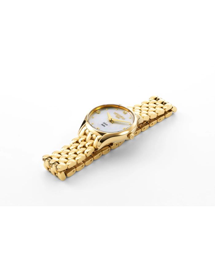 The magic sparkle of genuine diamonds on a shimmering mother-of-pearl dial makes the new Soleure Diamond an eye-catching, noble watch. But there is more to that the built-in precise Swiss-made quartz 2 H movement Ronda-762E-A2 measures time as precisely as you could wish. On the round dial of the elegant watch, four captivating real diamonds are complemented by eight delicately designed round indices. Two classic dauphine hands stand out against the shimmering mother-of-pearl dial. The 30 mm stainless steel case and seems to flow seamlessly into a stylish bracelet.