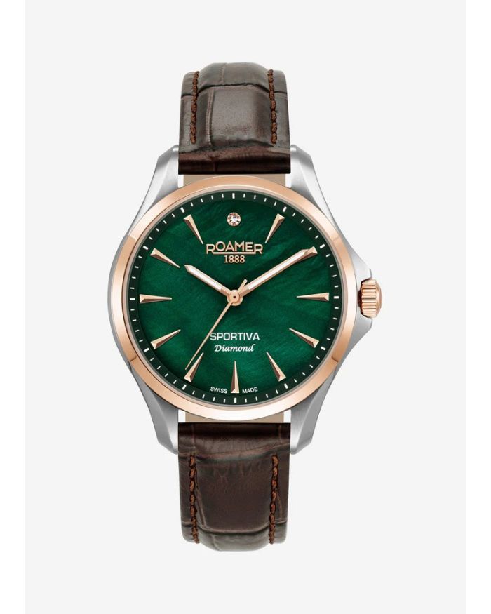 Introducing the Roamer Sportiva 865847-49-70-50, a stunning women's watch with a stainless steel case and strap in a chic silver/rose color combination. This timepiece features a vibrant green face, sapphire glass, and a reliable quartz movement by Ronda-763-A2. With a 36mm case size, 5 ATM water resistance, and a butterfly clasp, this watch is both stylish and functional. Elevate your look with the Sportiva collection from Roamer.