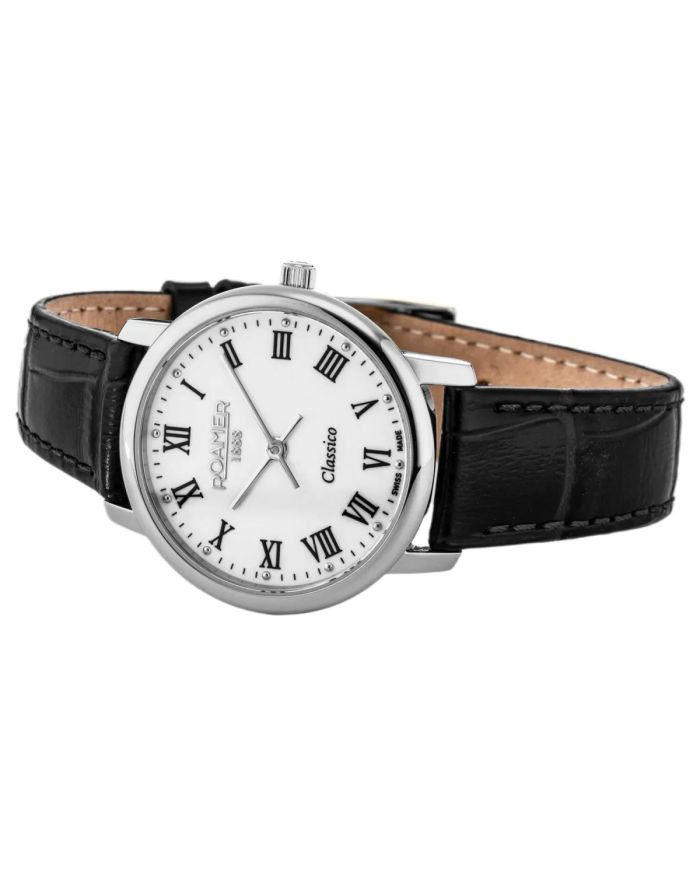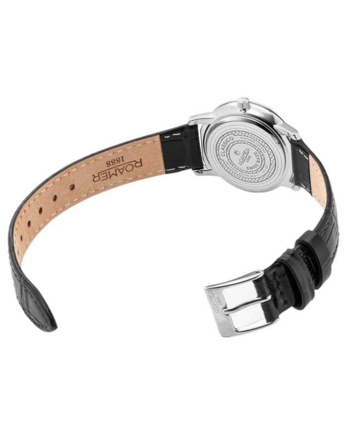 The Roamer 971857 41 25 05 Classico Leather Strap Wristwatch is a sophisticated timepiece for women, featuring precise Ronda quartz movement and a durable stainless steel case. Its black leather strap is crafted from natural leather and the white dial is shielded by scratch-resistant sapphire glass, boasting a 30mm case diameter.