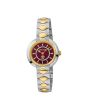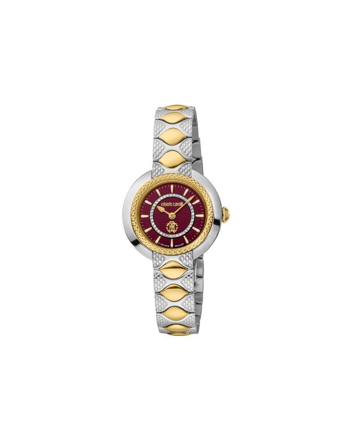 Roberto Cavalli by Franck Muller Women's Timepiece with Red Dial and Two-Tone Case. Crafted with a polished silver and gold case and a coordinating metal bracelet, this sophisticated watch highlights a bold red dial and two-hand movement. Combining the elegance of Italian aesthetics with the reliability of Swiss engineering, it offers water resistance up to 5 ATM—ideal for both everyday wear and refined occasions.