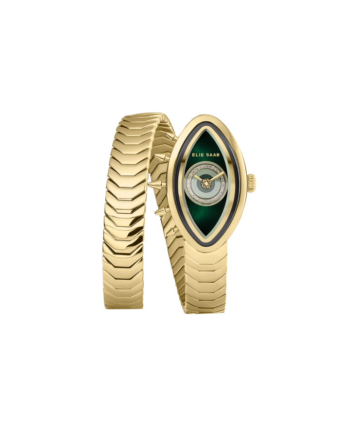 For those daring to be different, this sleek Swiss-movement gold-plated watch is a style statement that captures the essence of excellence. The case includes a dual-toned green sapphire dial adorned with 30 diamonds. The gold-plated double bracelet with butterfly buckle completes the chic, modern look.