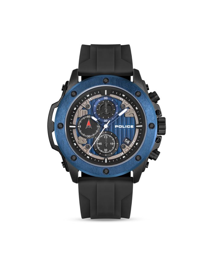 This Police watch has a case made of metal alloy with a diameter of 50 mm and is fitted with a rubber band. Inside the case lies a Sunon movement and the watch features a Mineral crystal.