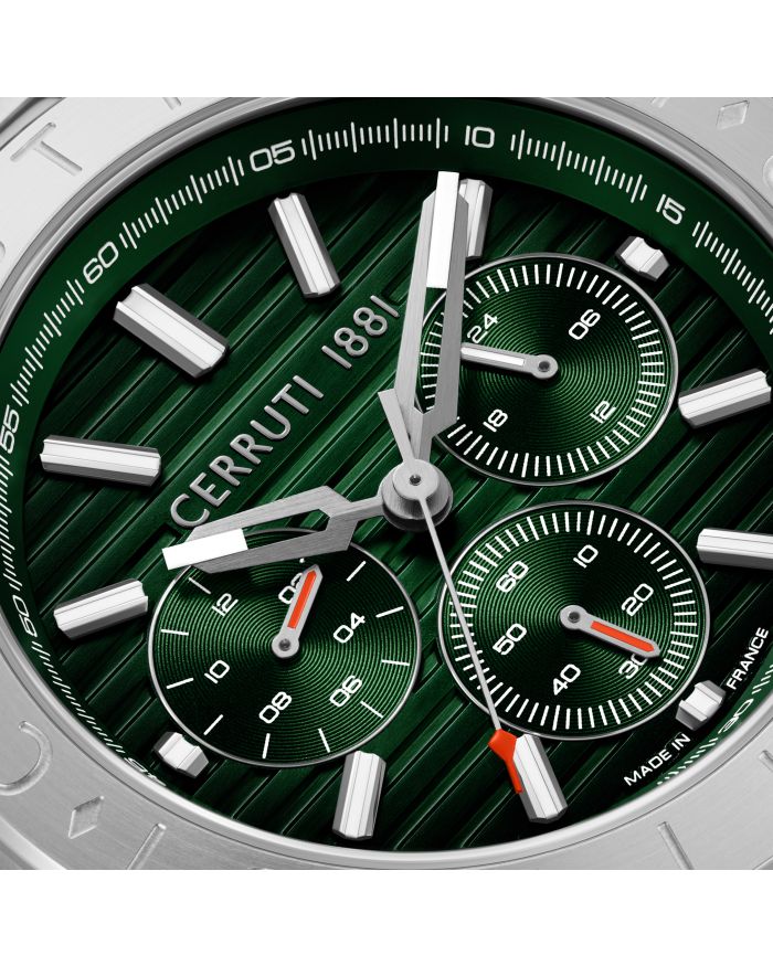 Cerruti 1881 Filiano CIWGK0085804 is a men’s watch combining silver stainless steel with a deep green dial for a modern yet classic look. It runs on a quartz movement and features sapphire-coated mineral glass. Water-resistant up to 100 meters, it’s suitable for swimming and everyday water exposure.