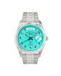 A distinctive timepiece featuring a sleek silver-tone case and a vibrant turquoise dial adorned with Arabic numerals. Powered by automatic movement, it blends heritage design with modern sophistication.